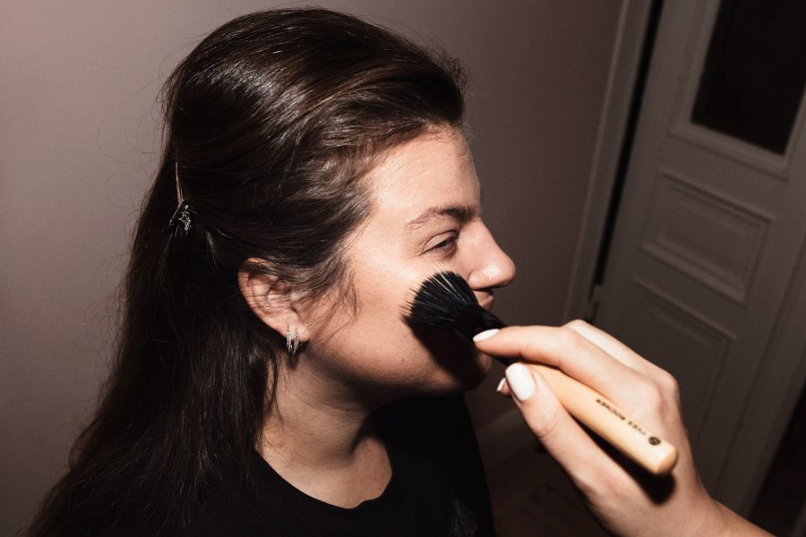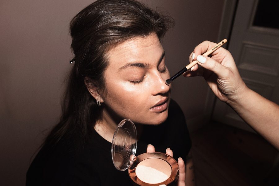 Nora började med att skulptera fram lite kindben med ett solpuder under kindbenen och highlighter på kindbenen och allt annat som sticker upp. Nora är så noggrann, jag brukar bara göra lite på måfå men som ni ser blir det också perfekt här. Hon gör det tom på näsan.